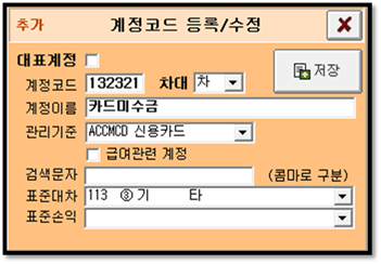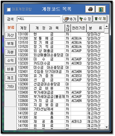 °¡´ÉÇÕ´Ï´Ù. °èÁ¤ÄÚµå º¯°æ½Ã´Â ¾Æ·¡ÀÇ ºÎ¿©±ÔÄ¢À» Âü°íÇÏ¿© ¼öÁ¤ÇϽñ⠹ٶø´Ï´Ù. °èÁ¤ÄÚµå º¸±â (´ÜÃàŰF4) ´ÜÃàŰF4۸¦ ´©¸£¸é °èÁ¤ÄÚµå °ü¸®È¸éÀÌ ÆË¾÷µË´Ï´Ù. ÁÂÃøÀÇ [ÀÚ»ê], [ºÎä], [ÀÚº»], [¼öÀÍ], [ºñ¿ë], [Á¦Á¶] µî ºÐ·ù¹öưÀ» Ŭ¸¯ÇÒ ¼ö ÀÖ½À´Ï´Ù.